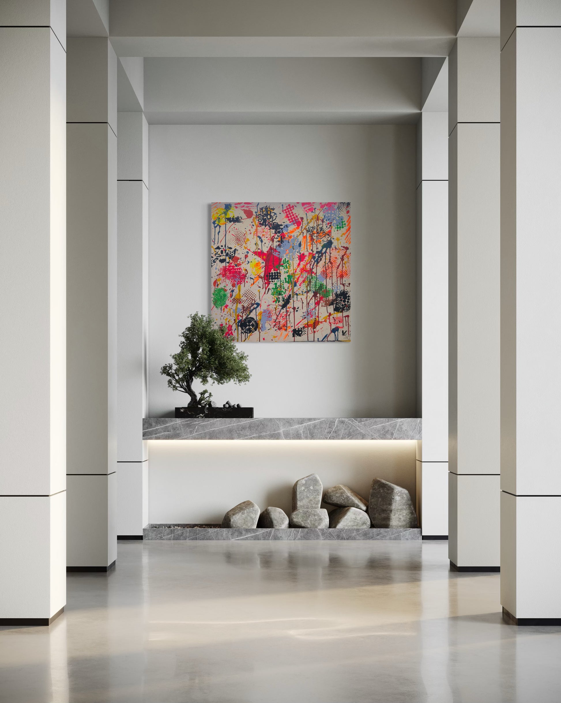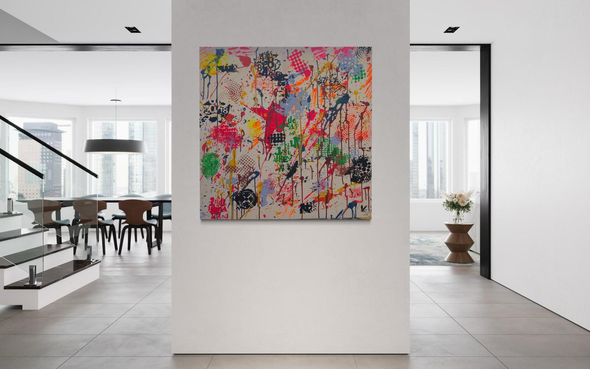 A Moment In Time reflects this lineage perfectly—it captures the rhythm, motion, and spontaneity central to Action Painting, but translated through a contemporary, urban lens with the inclusion of stenciled forms and pop-inflected color.
