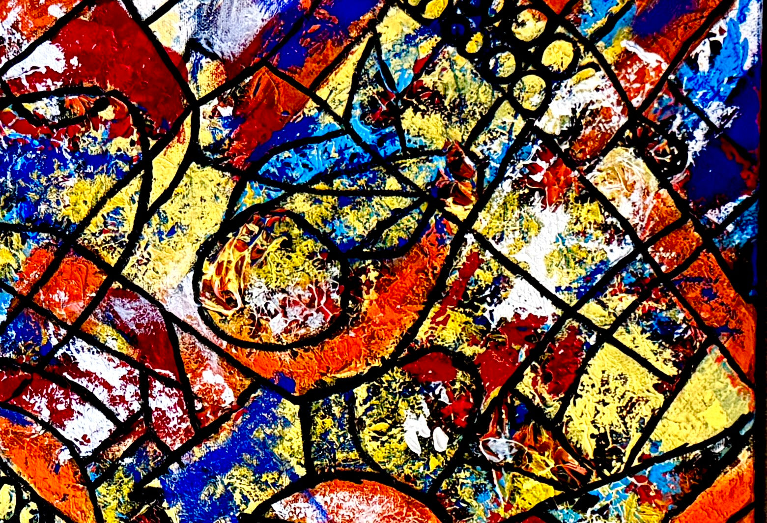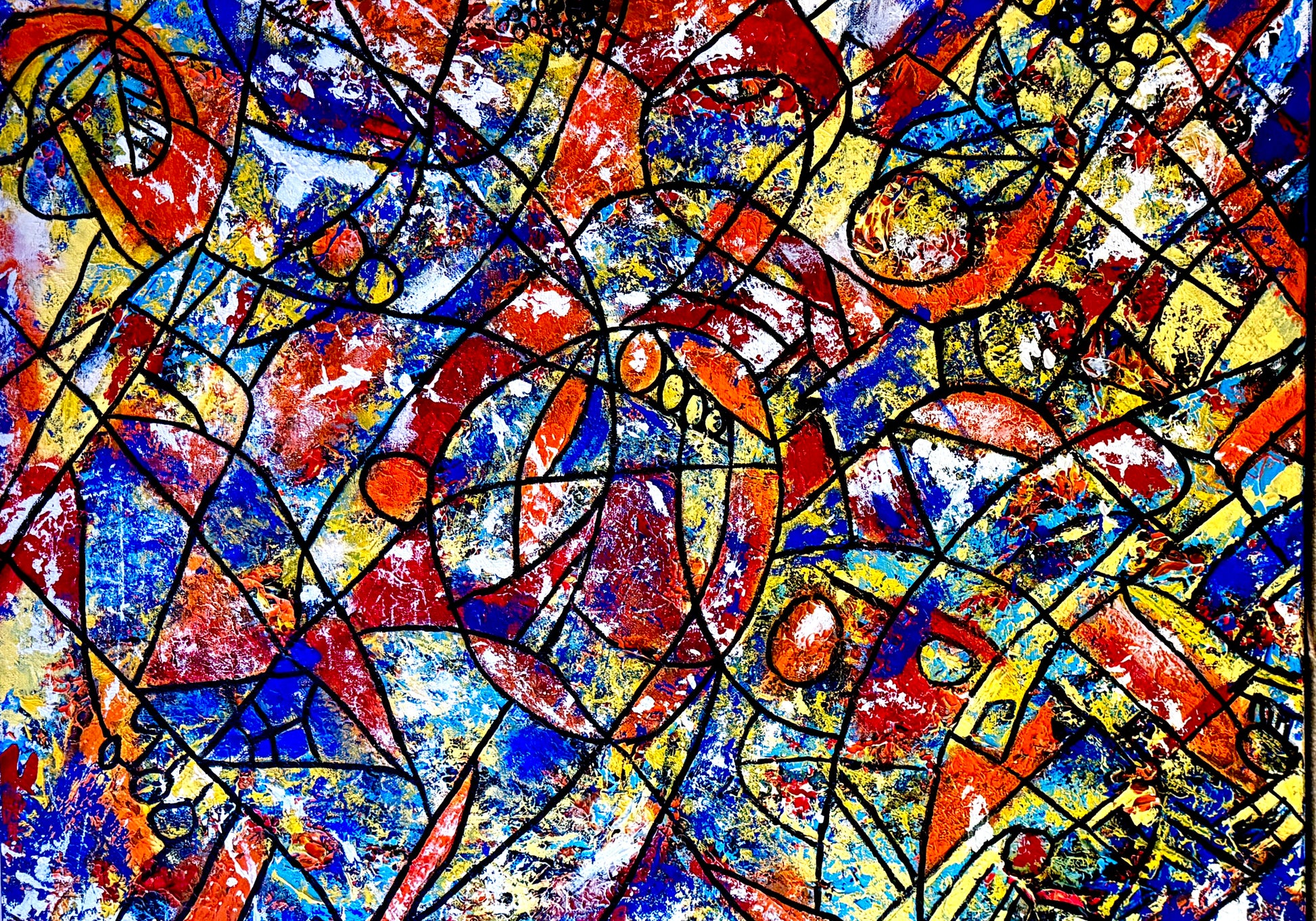 And There It Was” is about sudden clarity emerging from chaos. Vibrant layers of red, blue, yellow, and white collide, while bold black lines carve fractured paths across the canvas. The painting embodies the moment recognition arrives — sharp, undeniable, cutting through confusion.