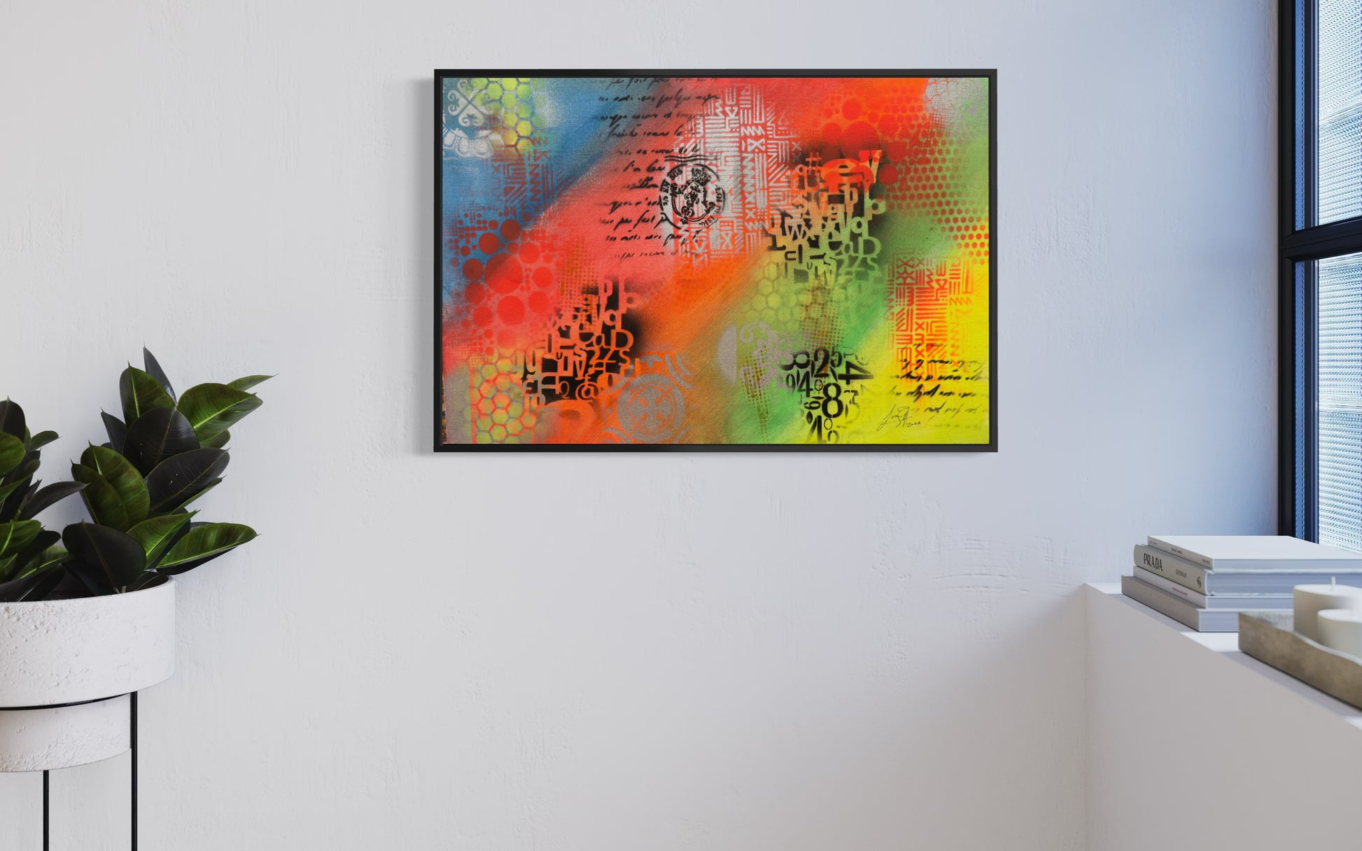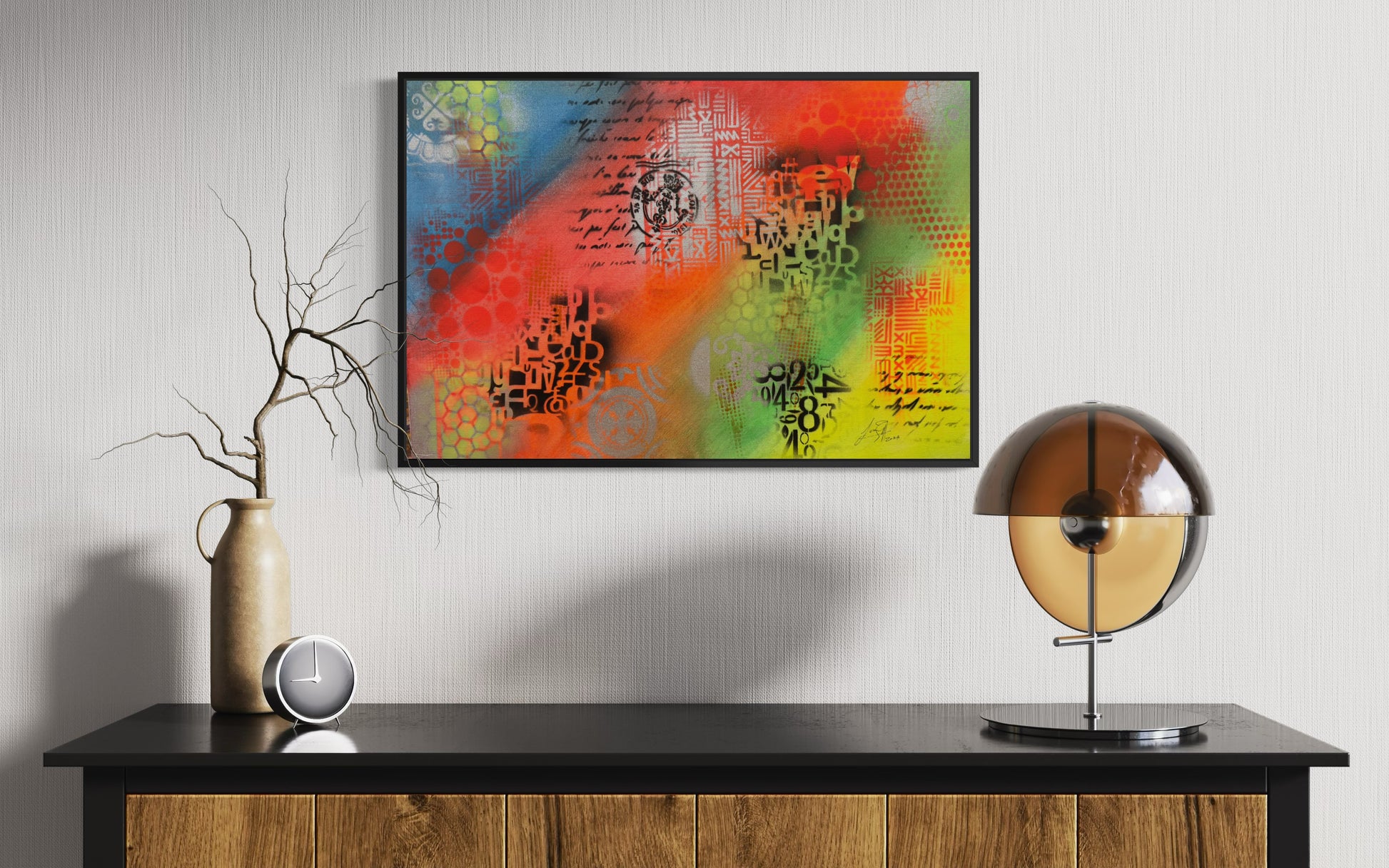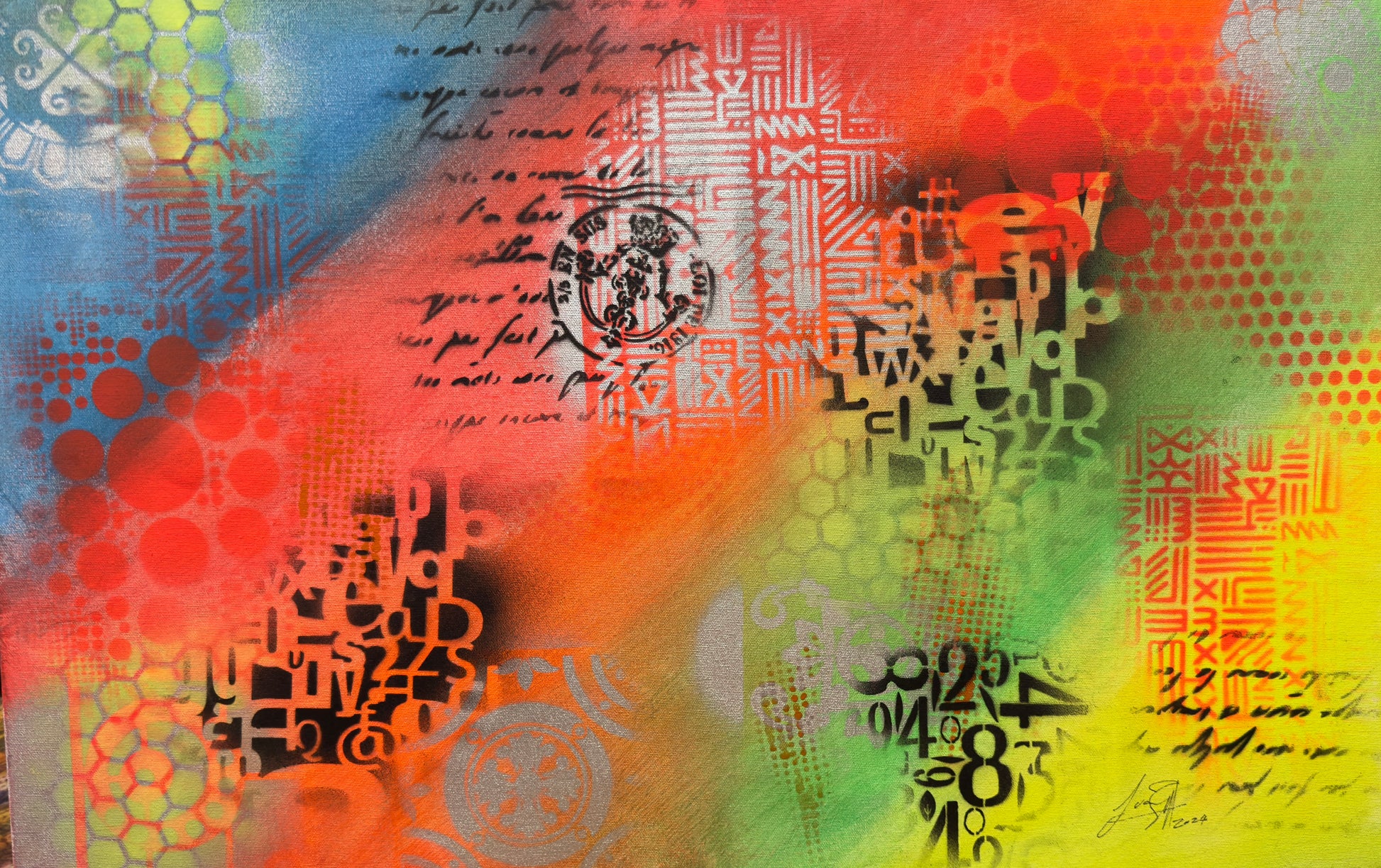 Joy is a layered celebration of colour and movement. Built through stencils, acrylic, and spray paint, it captures energy in motion — rhythm, laughter, and light colliding on the surface. I see joy as complex and textured, never flat or simple. It’s the beauty that persists through layers of experience, glowing from within.