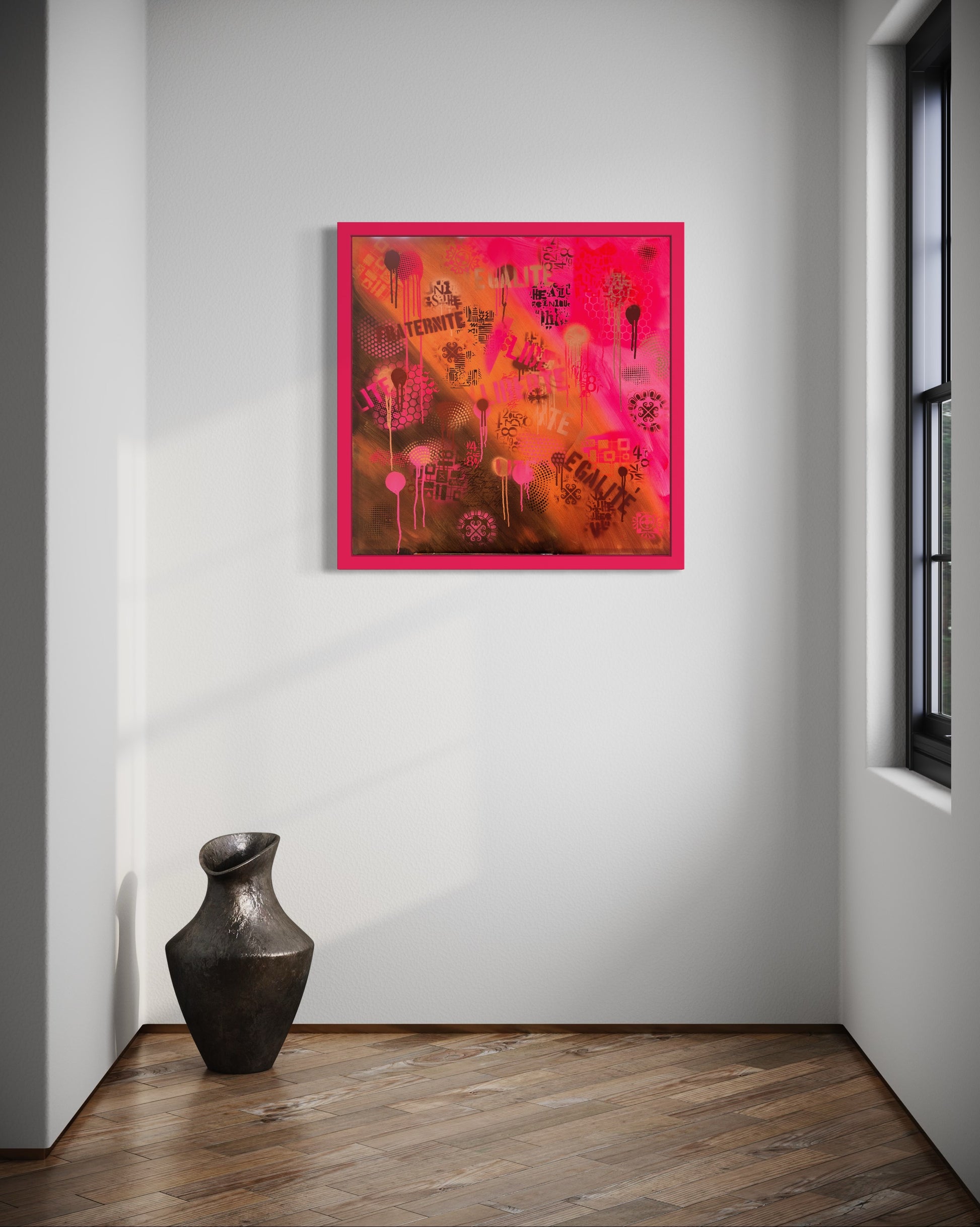 Liberté Fanées – Faded Liberties evolves around the ghost of the French tricolour — the once-vivid blue, white, and red of the Republic’s flag — now transformed into a diagonal sequence of fading hues. Instead of a literal banner, I paint its emotional afterimage: the cool blue has dissolved into shadowed violet and burnt umber; the white into weathered orange light; and the red into electric pinks and bleeding magentas.