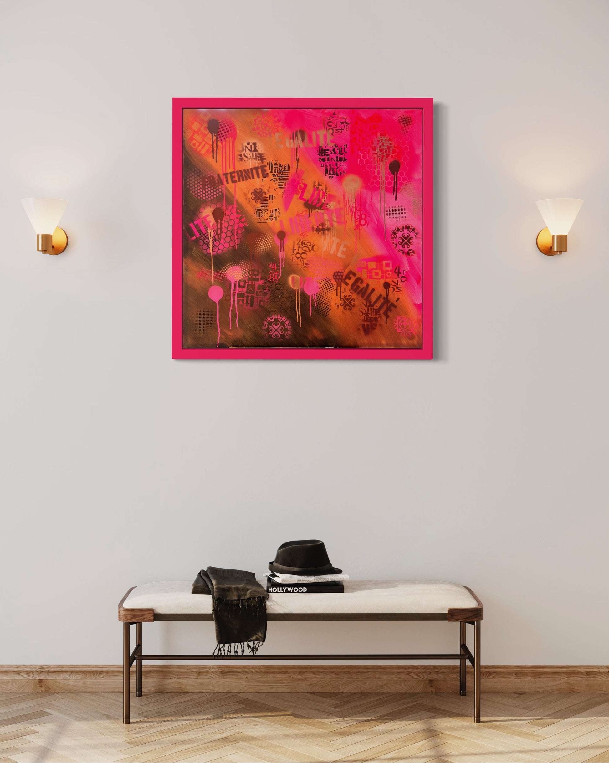 Across the work, the stencilled words — LIBERTÉ, ÉGALITÉ, FRATERNITÉ — repeat like distant chants. The layered honeycombs and coded motifs (some recalling cultural or mathematical order) act as scaffolds of meaning beneath the corrosion. It is both street wall and sacred relic — revolutionary wallpaper after a century of weather.