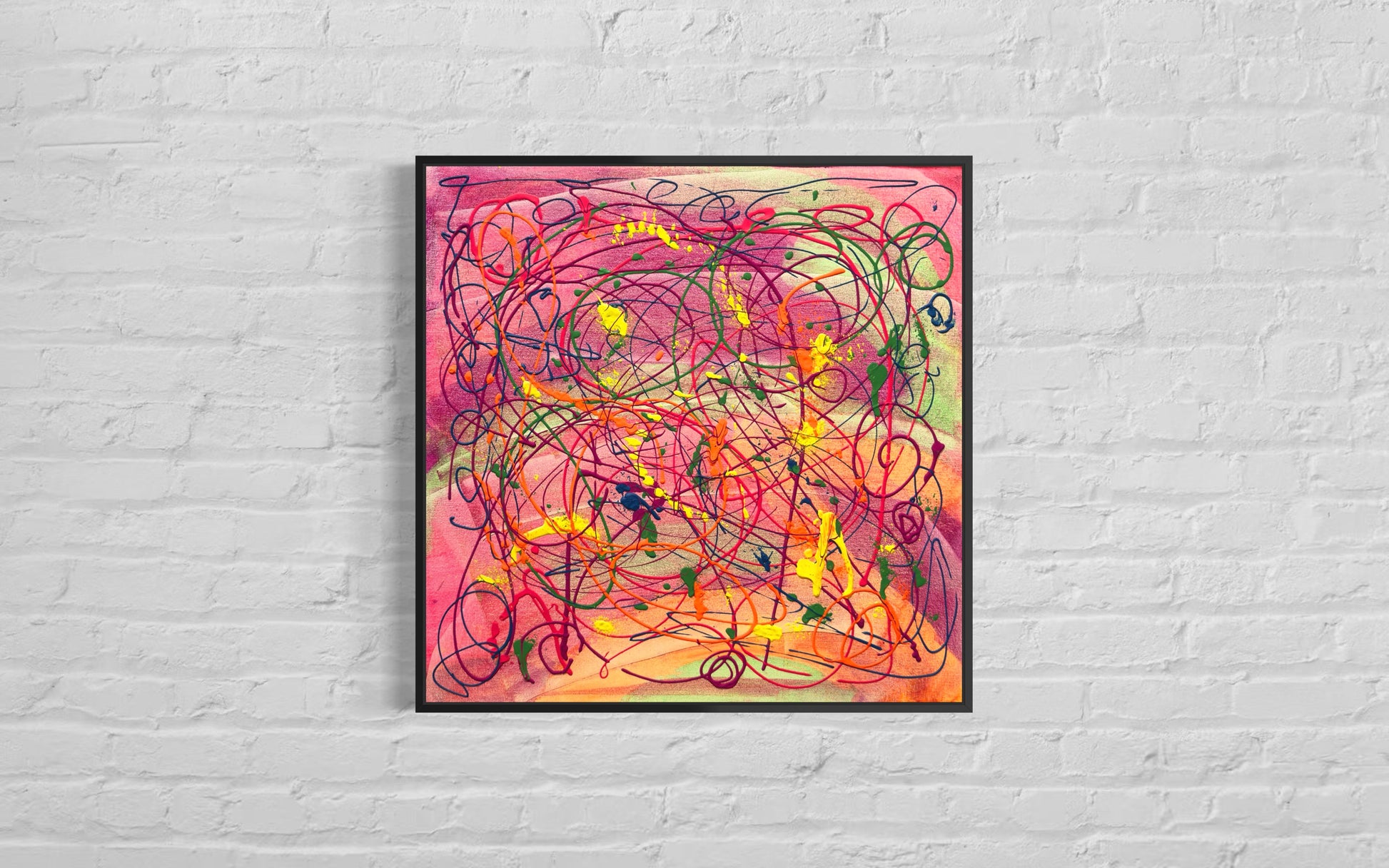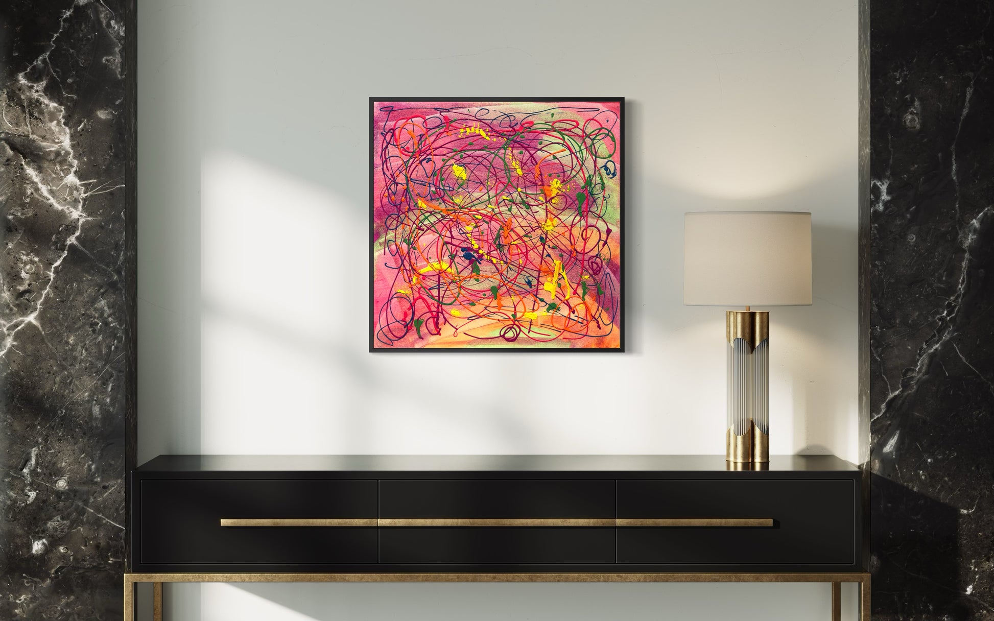 Madness is my surrender to chaos — an unfiltered burst of colour, movement, and emotion. I worked quickly, letting intuition lead, allowing the lines and drips to record motion and thought as one. The bright, clashing tones of yellow, pink, and green echo the intensity of the creative act itself. It’s not about confusion, but liberation — the freedom within losing control
