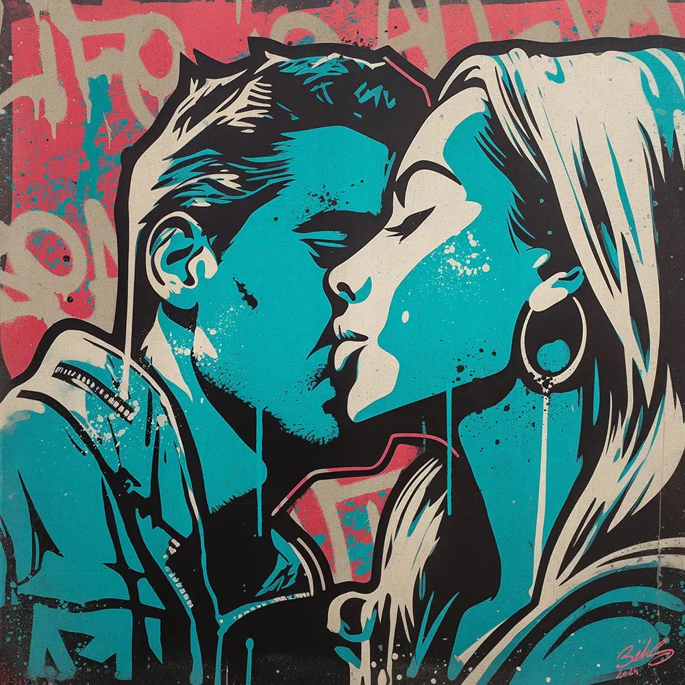 In this piece, I wanted to merge the emotional intimacy of love with the visual language of the street. Mon Amour 2 is deliberately loud in colour and graphic in form, because affection itself can be unapologetic — a graffiti mark across the quiet wall of daily life. The turquoise and pink tones, speak to both tenderness and defiance. My stencil work here lets me construct emotion in layers, much like the city itself — built, erased, rebuilt, and always alive. Love, for me, isn’t polished; it’s painted over concrete, it’s raw and real.