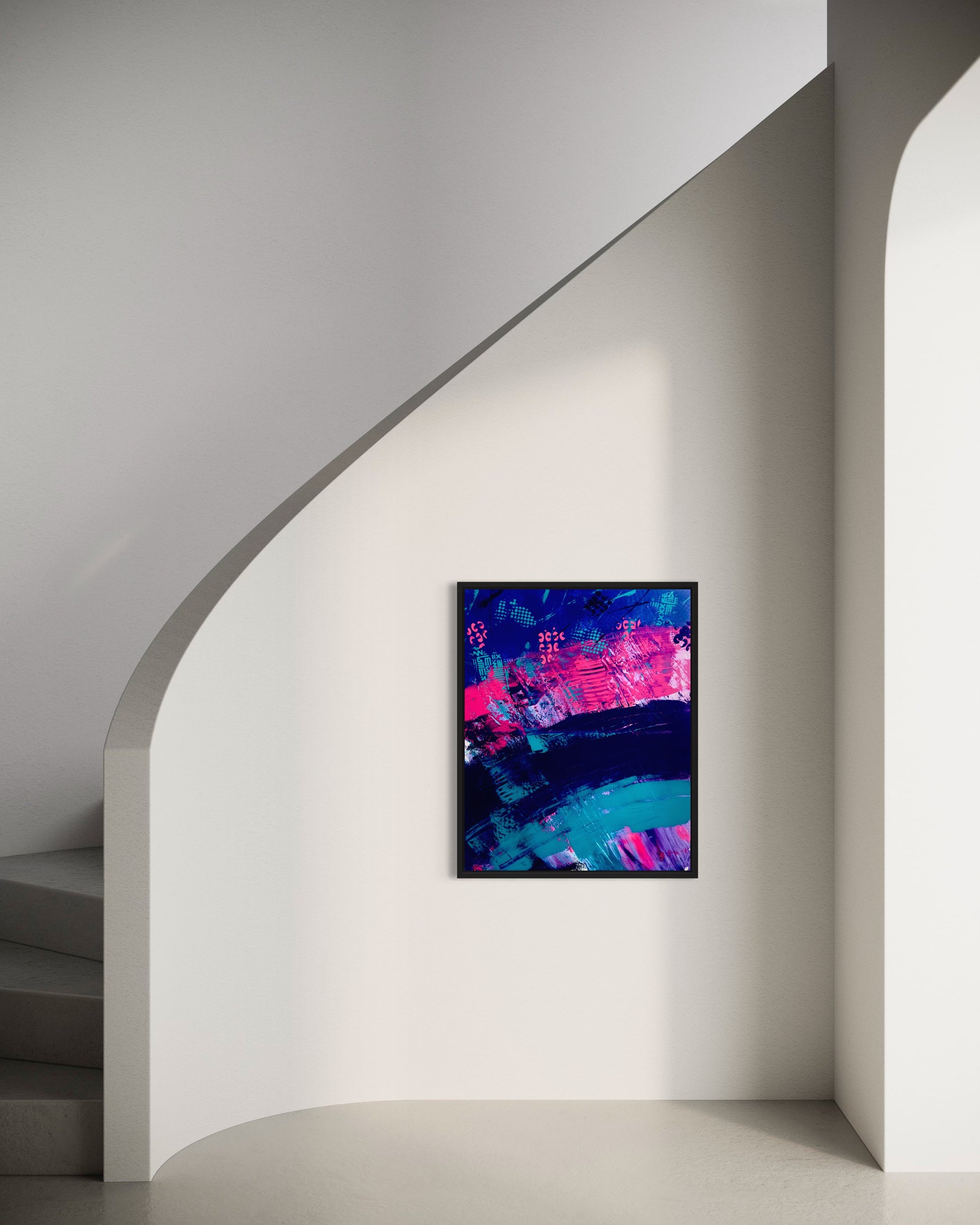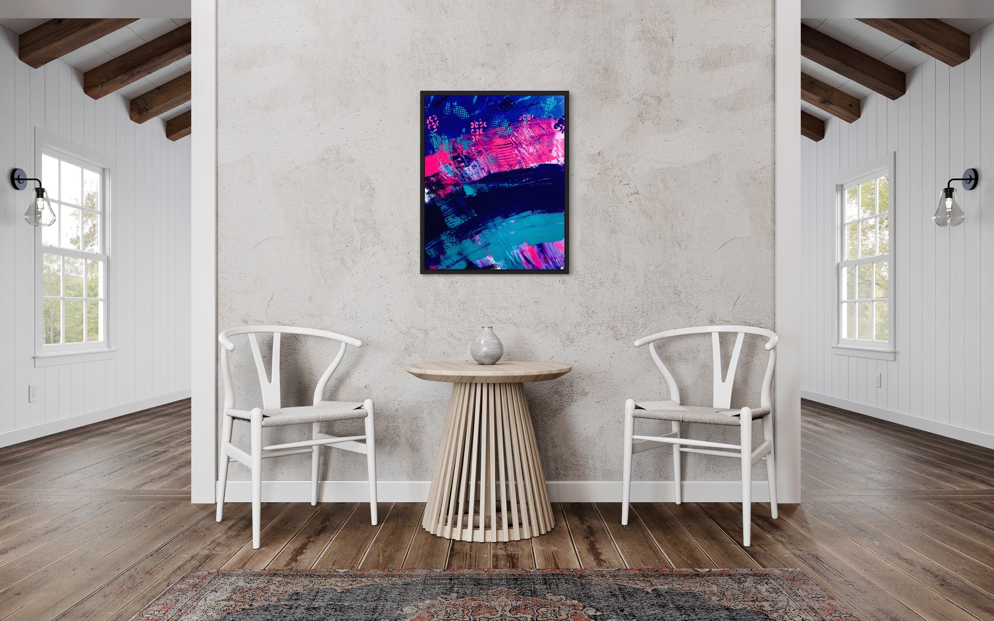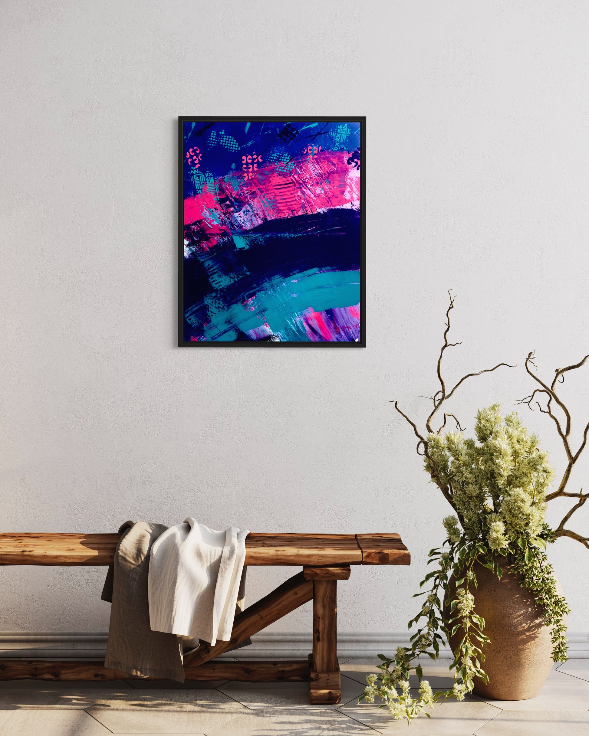 In Phantoms in the Fog, I wanted to express that elusive space between clarity and confusion — where shapes, memories, and emotions blur together. When I painted this, I felt as though I was chasing something unseen, something that shimmered at the edge of understanding. The bold transitions from dark violet to luminous turquoise mirror how light breaks through emotional fog — how presence can return after absence. This painting is about emergence, the persistence of spirit, and the beauty that lives within uncertainty.