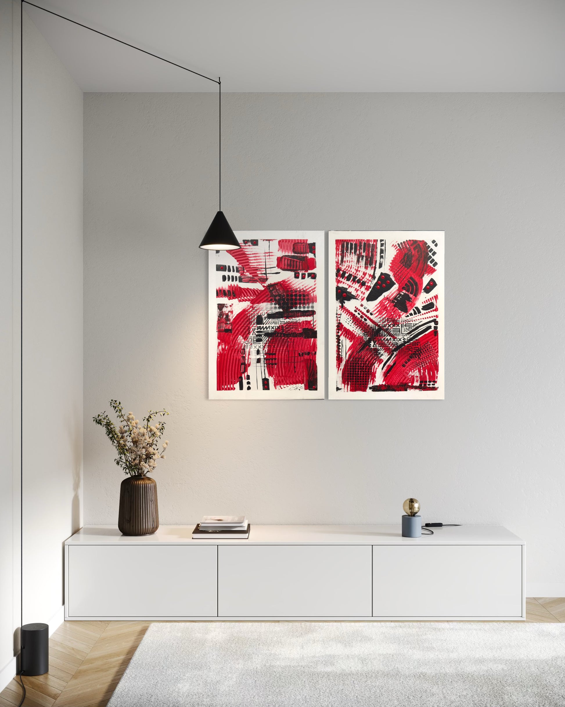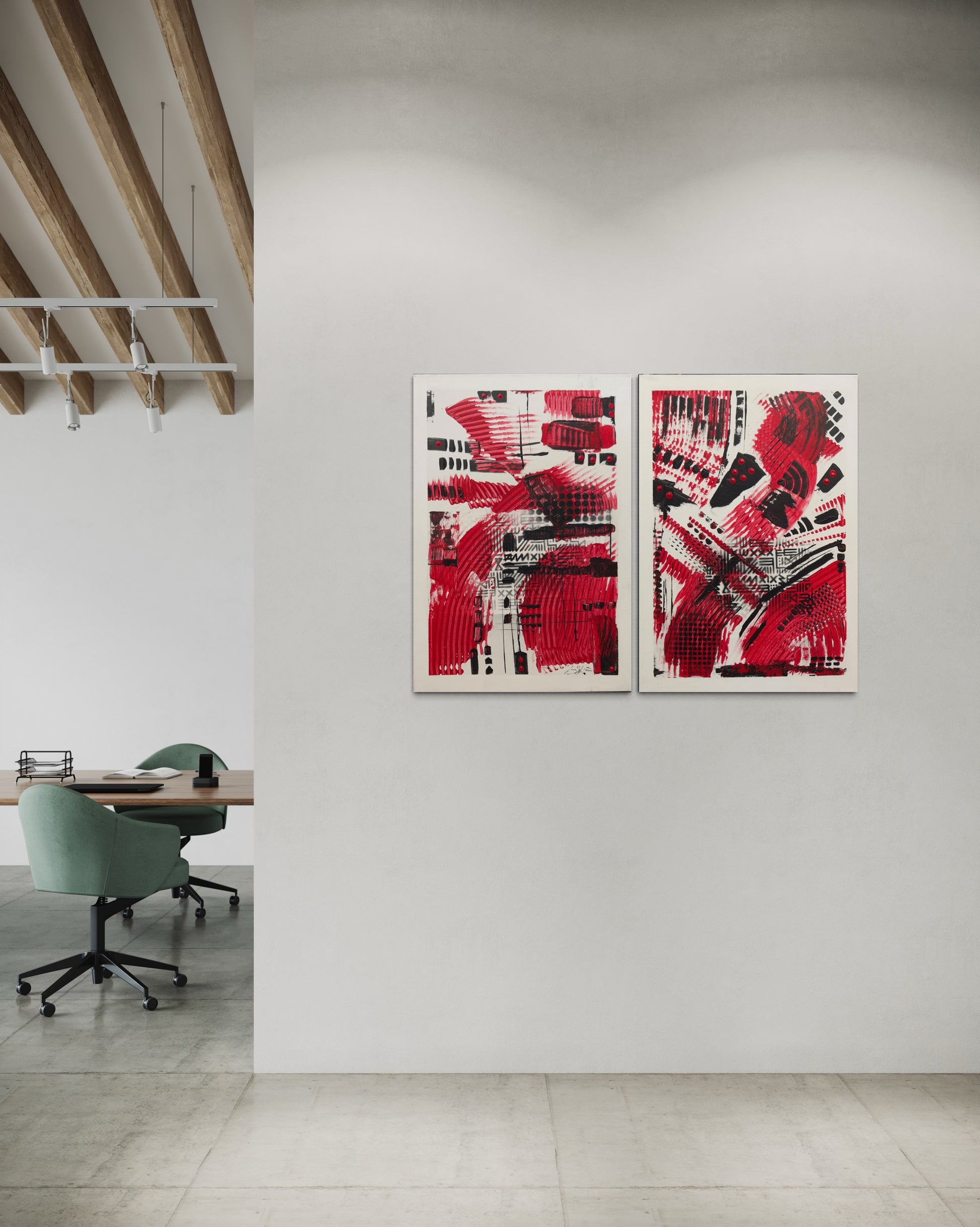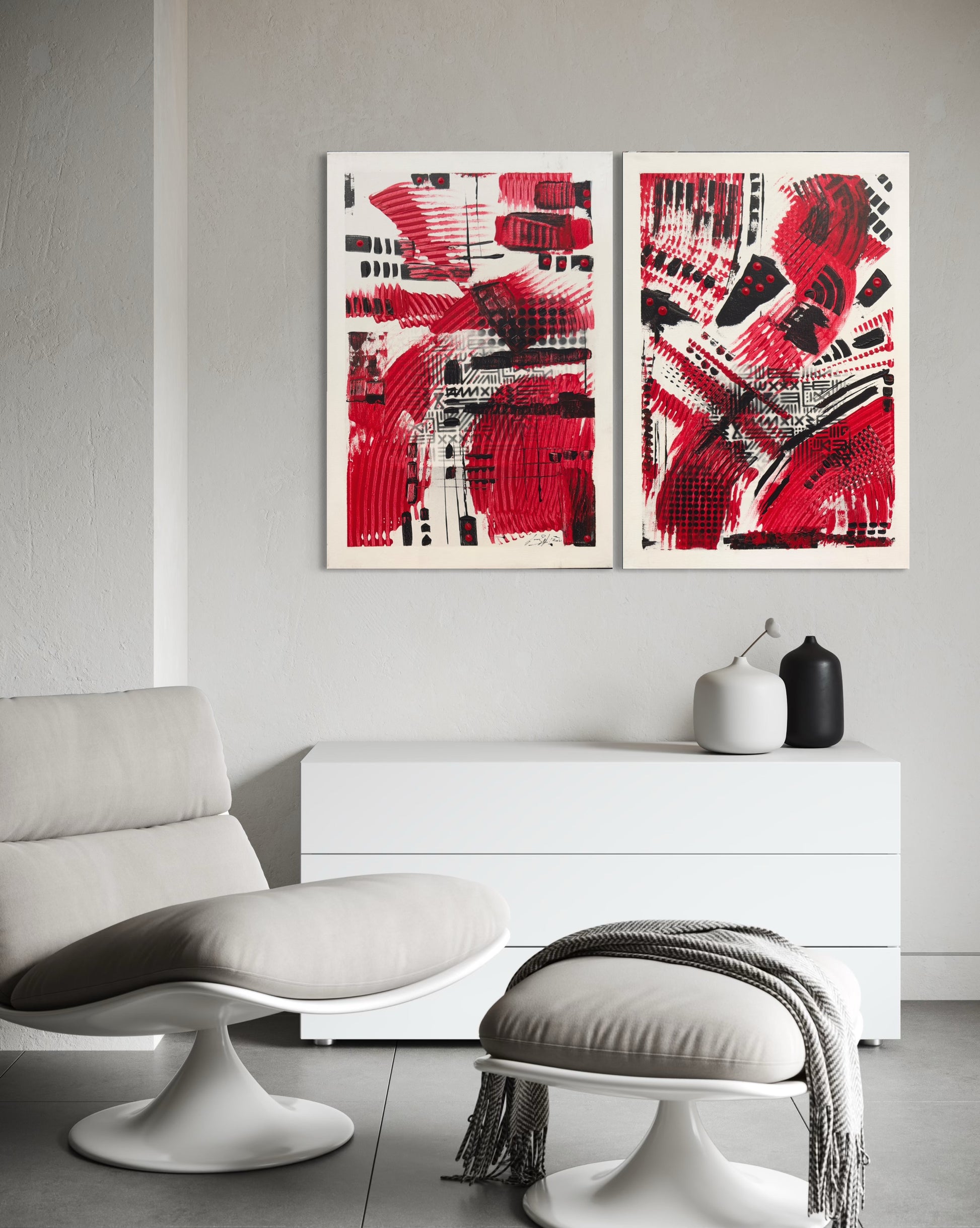 Red Riders captures the momentum of survival and drive. Using layered acrylic, spray paint, and self-cut stencils, I built two canvases that converse in rhythm and tension. The red surges forward — urgent and alive — while black elements punctuate and stabilize, creating a coded balance between motion and control. The forms suggest energy in flux, riders charging through uncertainty yet refusing to halt. This diptych reflects my ongoing exploration of resilience, rhythm, and emotional velocity — a visual reminder that even in chaos, forward movement remains a form of strength.