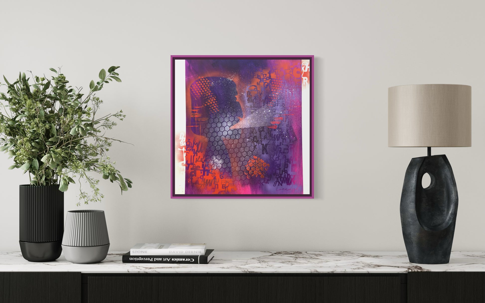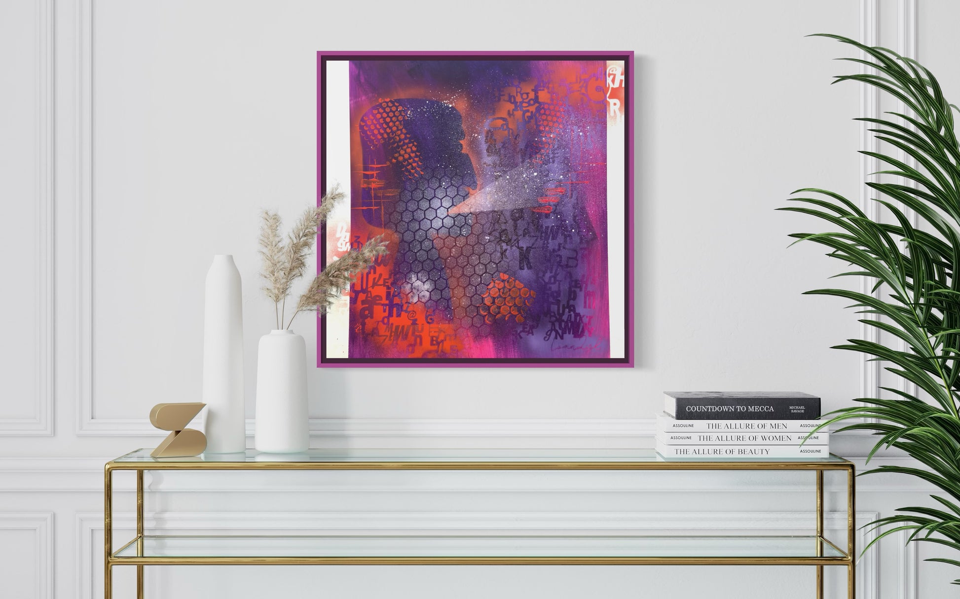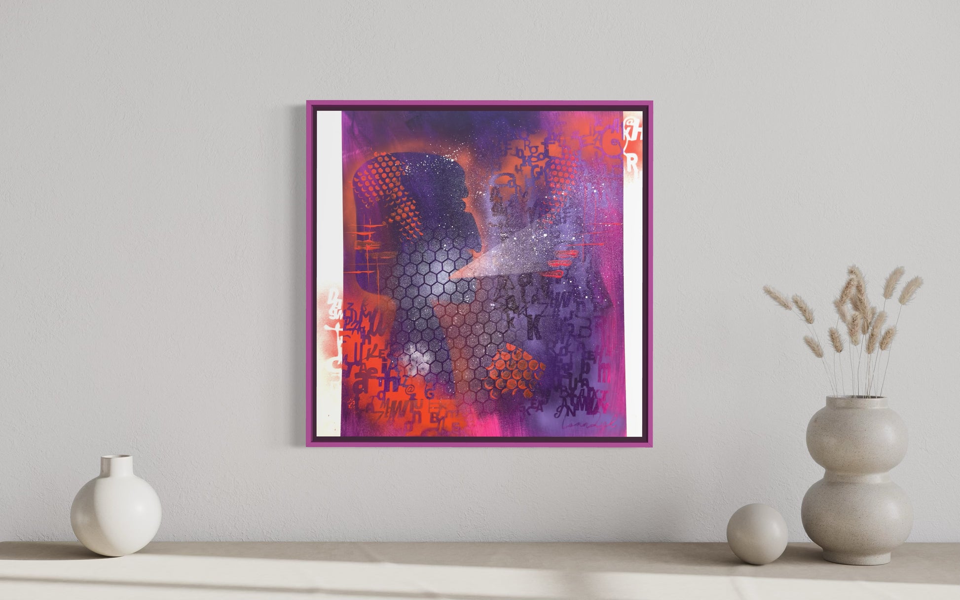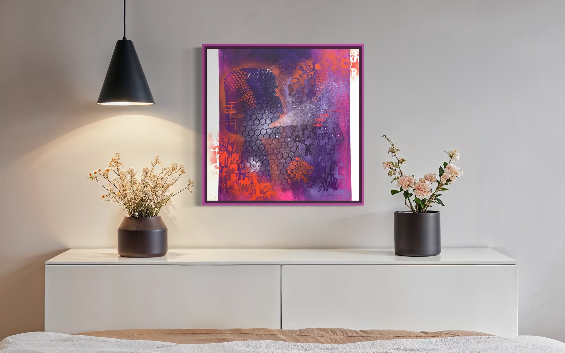 The Ancients Shouting explores the moment when old voices pierce through modern noise. I layered acrylic, spray paint, and stencil forms to suggest coded communication — a mix of pattern, figure, and rhythm. The colours vibrate between stillness and energy, evoking the urgency of messages that refuse to be forgotten.
