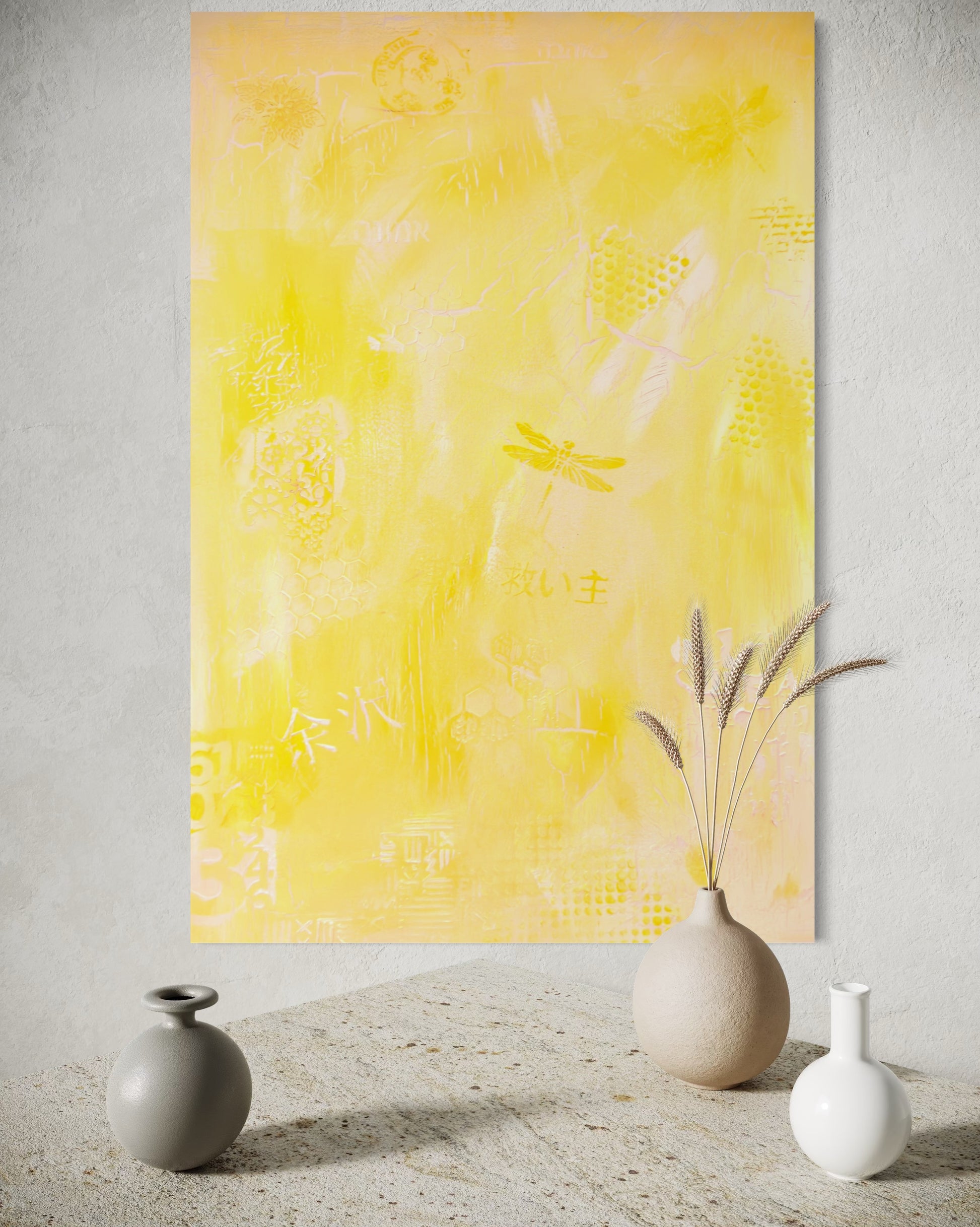 Saved By The Sun explores how memory and light coexist—how traces of time and presence can be held within colour and surface. Through layered acrylic and subtle textural impressions, I created a luminous field where forms emerge and dissolve, suggesting fragments of memory suspended in radiance.The restrained palette of yellows and soft whites evokes warmth, stillness, and reflection—an atmosphere where light itself becomes a keeper of memory. Embedded symbols and patterns appear like faint recollections, barely perceptible yet quietly enduring. Saved By The Sun is a meditation on impermanence and illumination—the way light preserves what fades and transforms the act of remembering into something timeless.